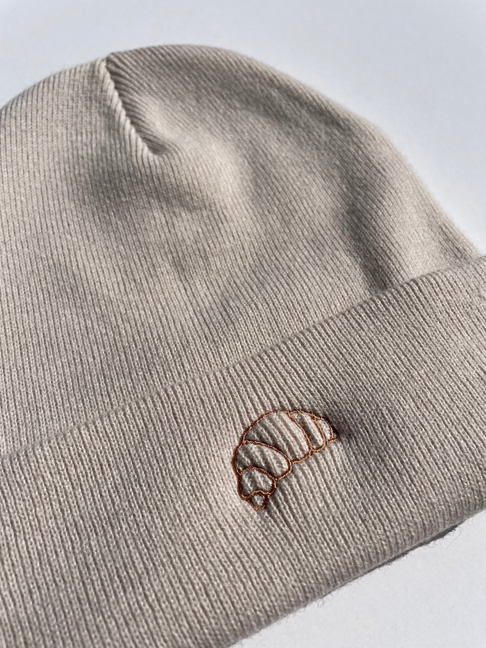 Bestickte Beanie mit Croissant – Unisex Mütze in Almond