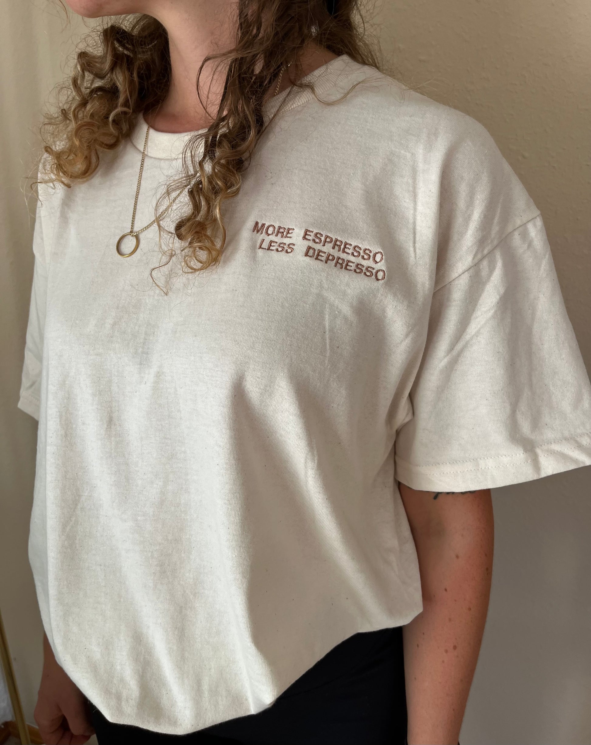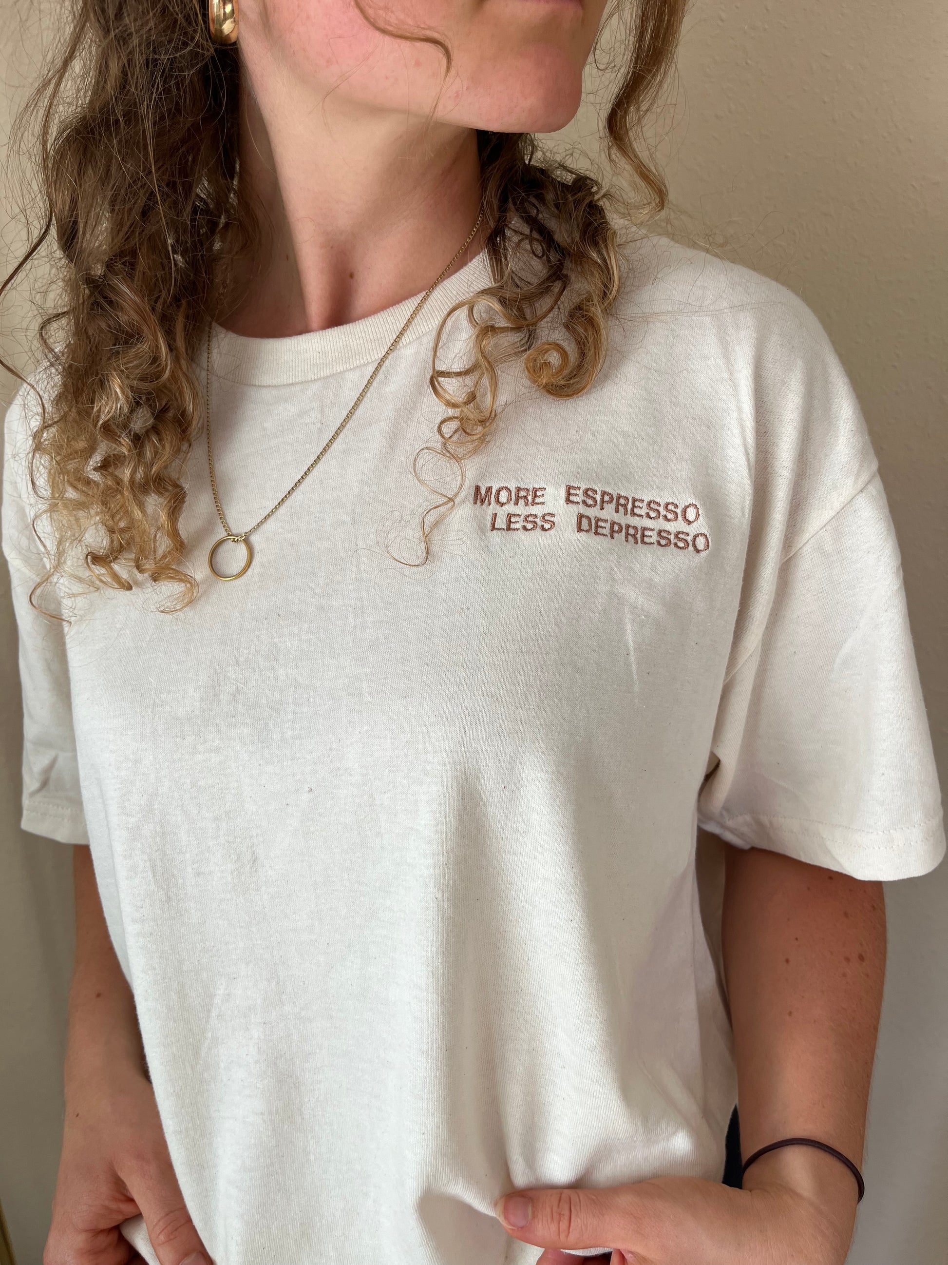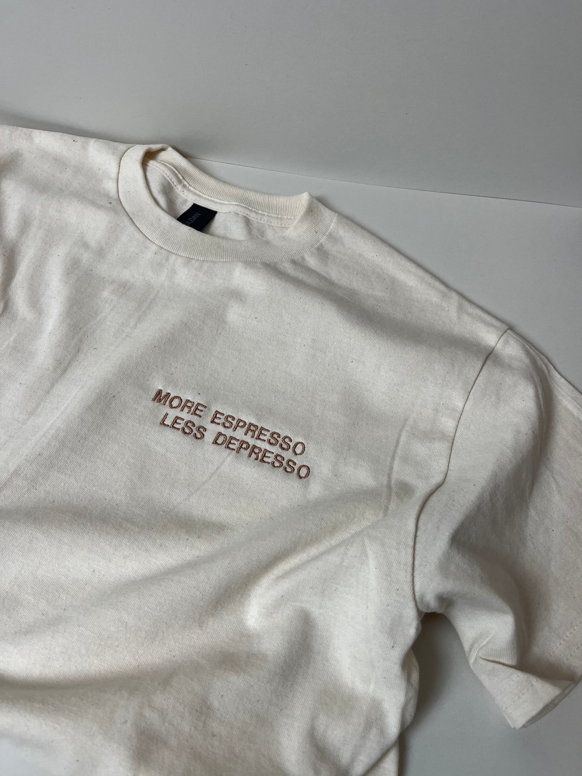 Natural-farbenes Regular-Fit T-Shirt mit Frontmotiv „More Espresso, Less Depresso“. Gefertigt aus 100 % zertifizierter Bio-Baumwolle – fair produziert unter den Standards der Fair Wear Foundation (Leader Status). Der etwas schwerere Stoff sorgt für langlebigen Tragekomfort im Alltag.